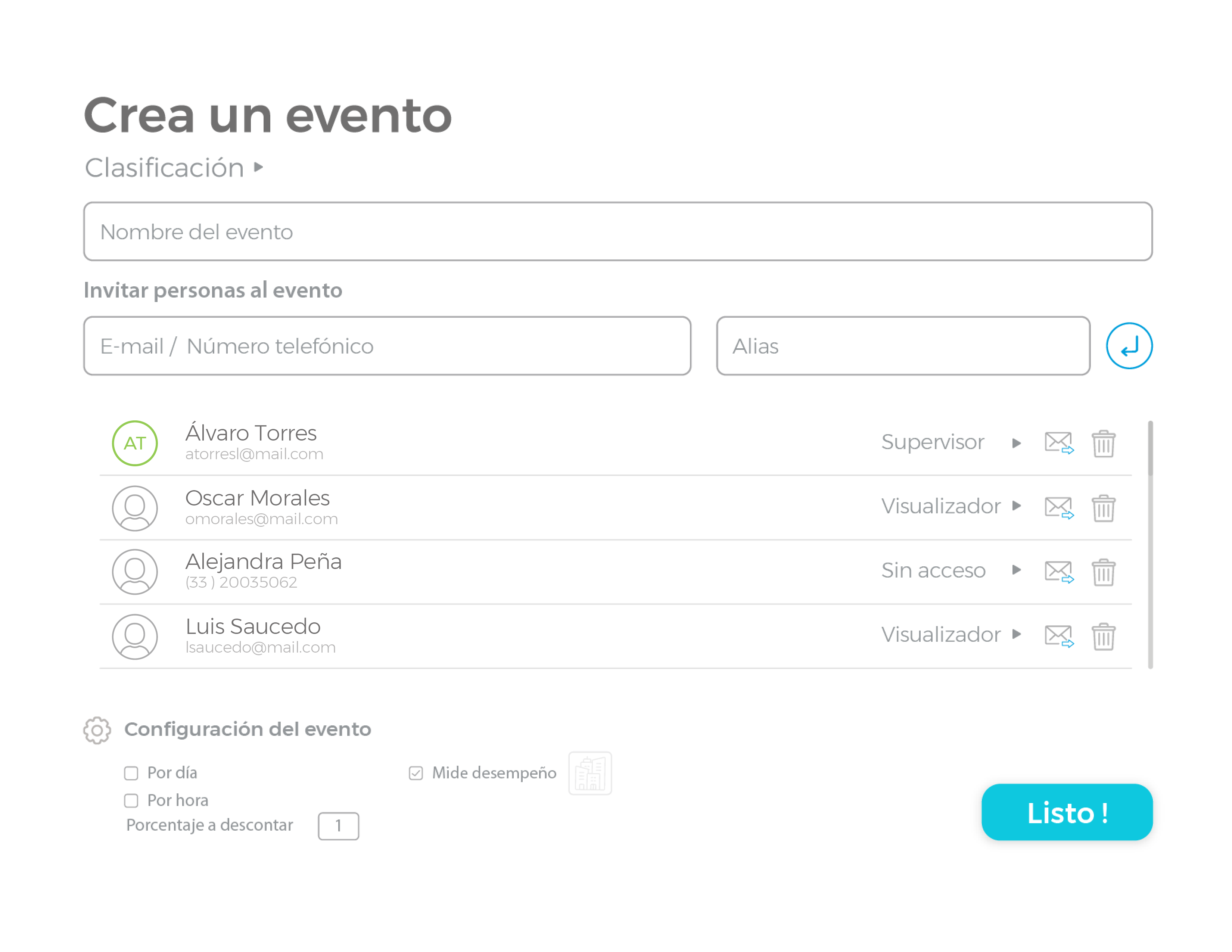 Invita a quien tú quieras a colaborar en tus eventos, sólo agrega su correo electrónico o número telefónico y comienza a trabajar con ellos.